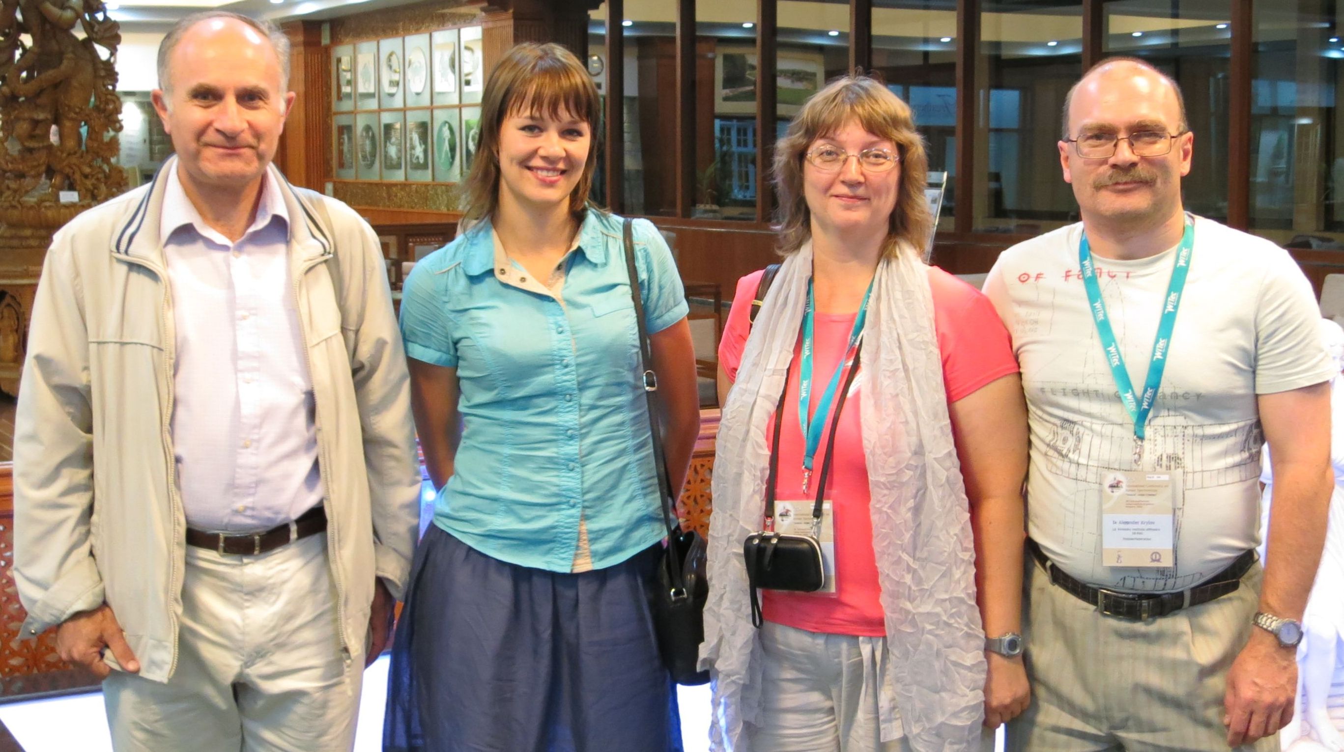 Участники конференции International Conference Raman Spectroscopy, Bangalore, India. Слева направо : Сергей Казарян (Imperial College of London, United Kingdom), Елена Соловьева (Санкт-Петербургский Государственный Университет), Светлана Крылова (Институт физики им. Л.В. Киренского Сибирского отделения Российской академии наук (ИФ СО РАН)), Александр Крылов (ИФ СО РАН), 2012 год. India.