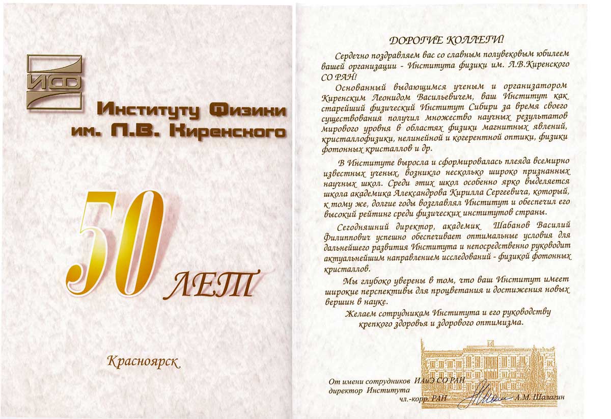 Вы здесь: Главная / Документы / Поздравления с 50-летием Института / Институт АиЭ СО РАН