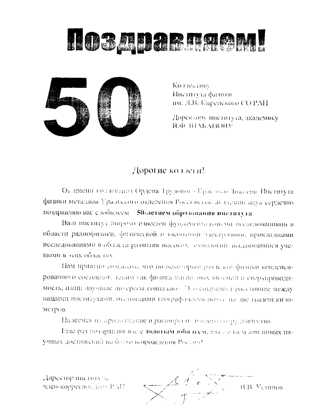 Вы здесь: Главная / Документы / Поздравления с 50-летием Института / Институт физики металлов УрО РАН