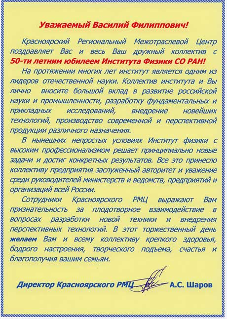 Вы здесь: Главная / Документы / Поздравления с 50-летием Института / Красноярский региональный межотраслевой центр