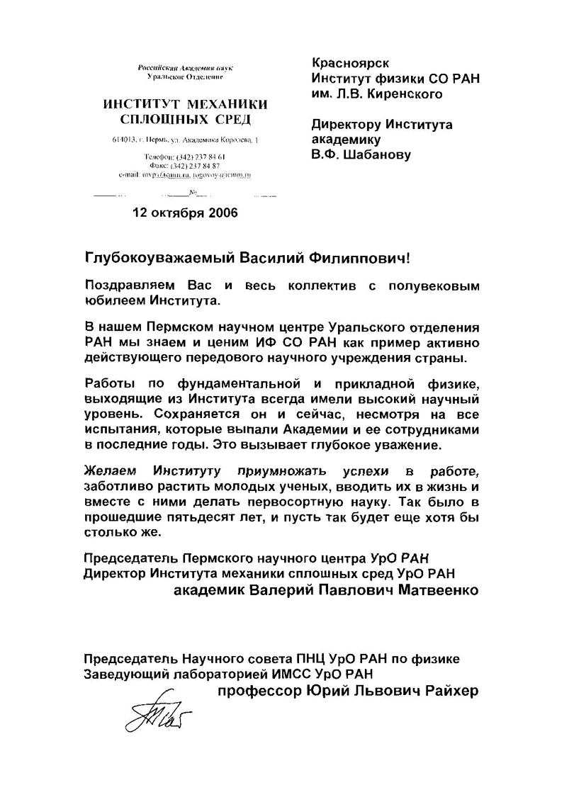 Вы здесь: Главная / Документы / Поздравления с 50-летием Института / Пермский научный центр УрО РАН (Институт механики сплошных сред)