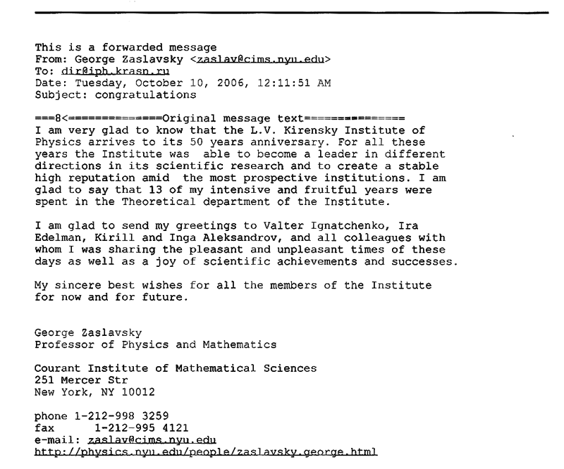 Вы здесь: Главная / Документы / Поздравления с 50-летием Института / George Zaslavsky, Professor of Physics