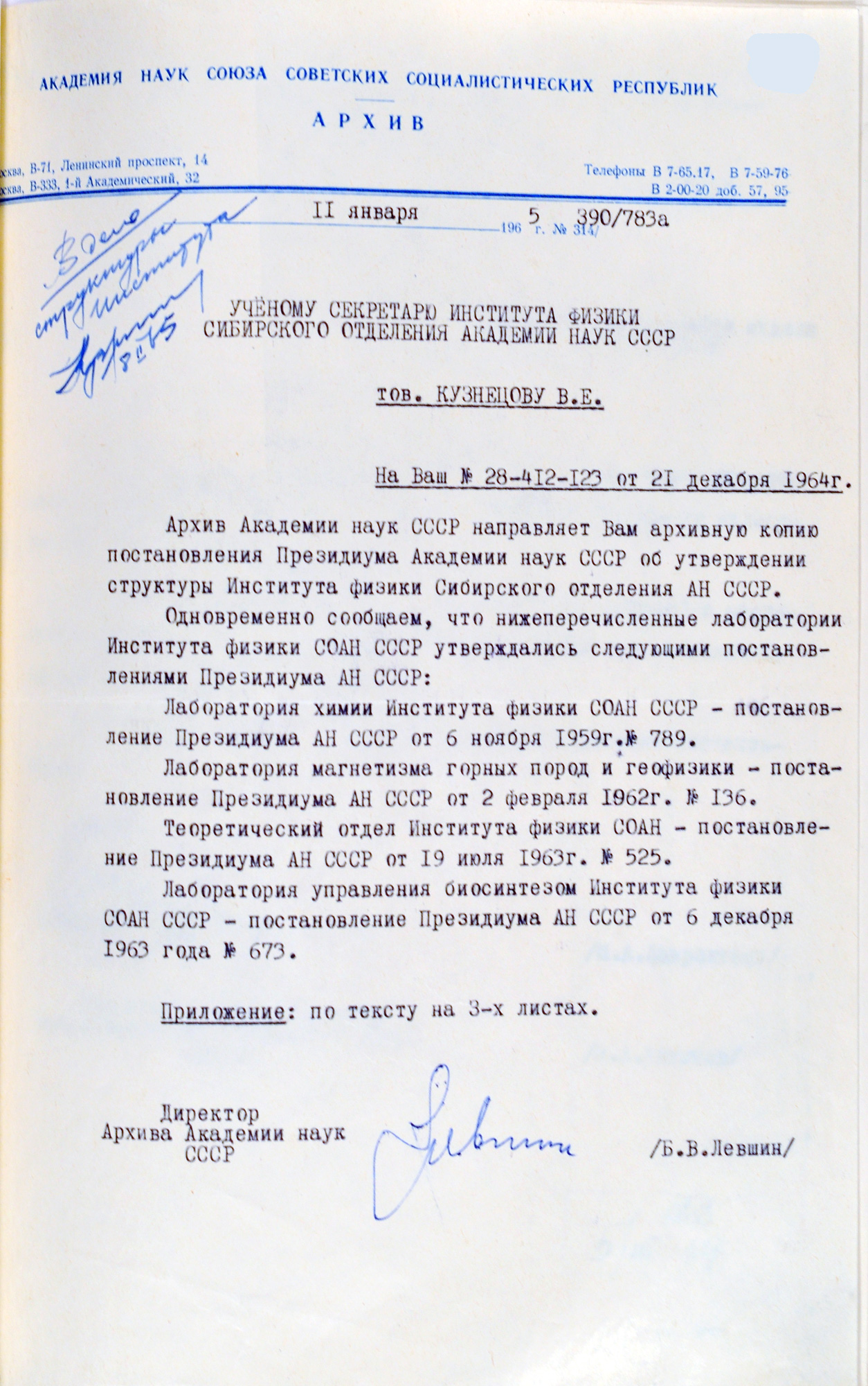 Архивная выписка об утверждении структуры Института физики