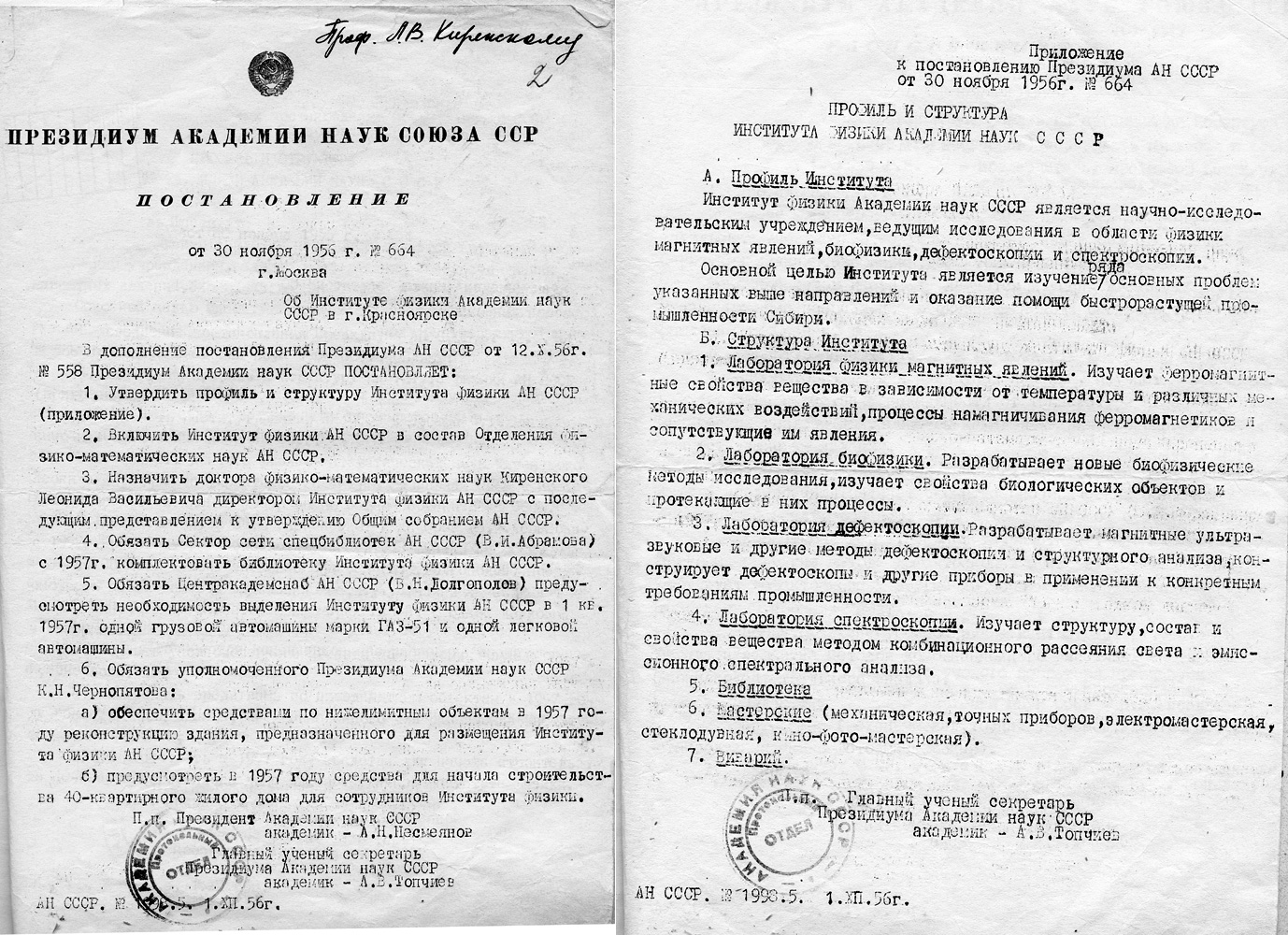 Дополнение (и приложение) к Постановлению Президиума Академии наук СССР № 558 от 12 октября 1956 года «Об организации Института физики Академии наук в Красноярске».