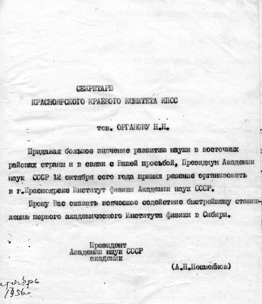 Копия письма Президента АН СССР секретарю краевого комитета КПСС, 1956 г.