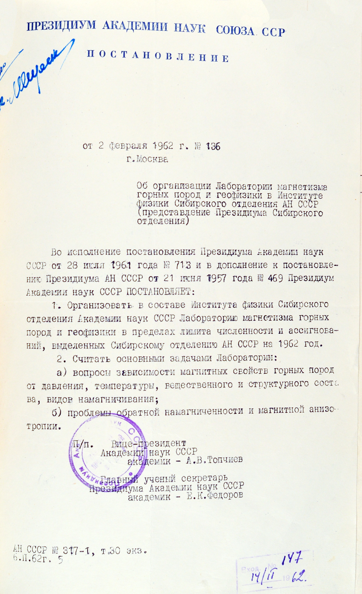Постановление об организации лаборатории магнетизма горных пород и геофизики