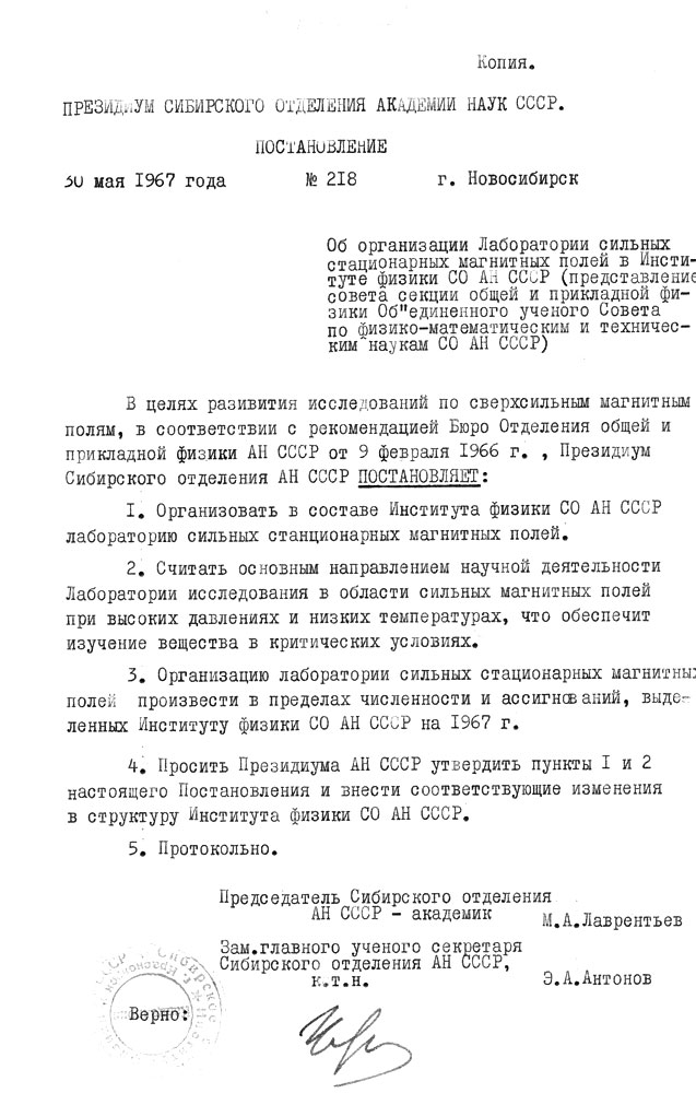 Постановление об организации лаборатории сильных стационарных магнитных полей