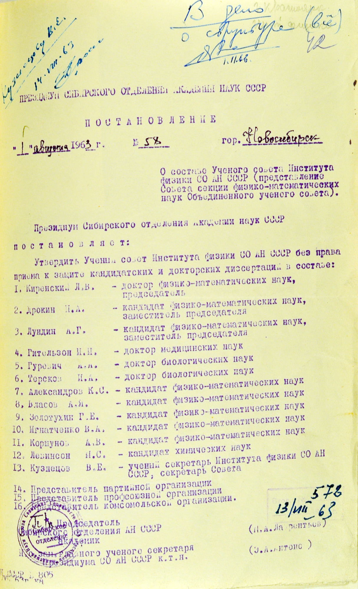 Вы здесь: Главная / Документы / Из архива Института физики / Ученый Совет ИФ СО АН СССР / Постановление о составе Учёного совета ИФ