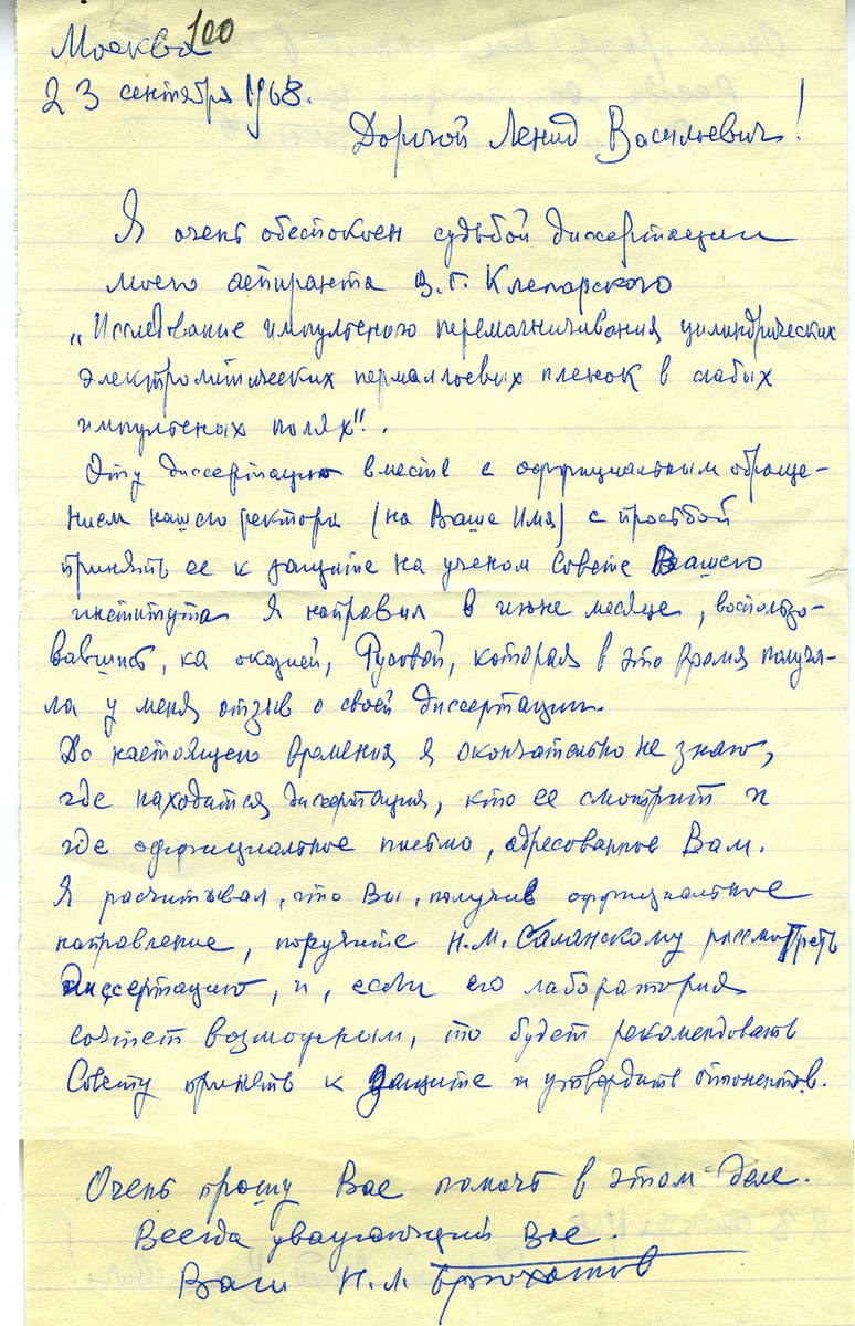 Вы здесь: Главная / Документы / Переписка Л. В. Киренского / Письма к Л. В. Киренскому / Николай Львович Брюхатов, доцент кафедры физики МГУ, руководитель дипломной работы Л.В. Киренского