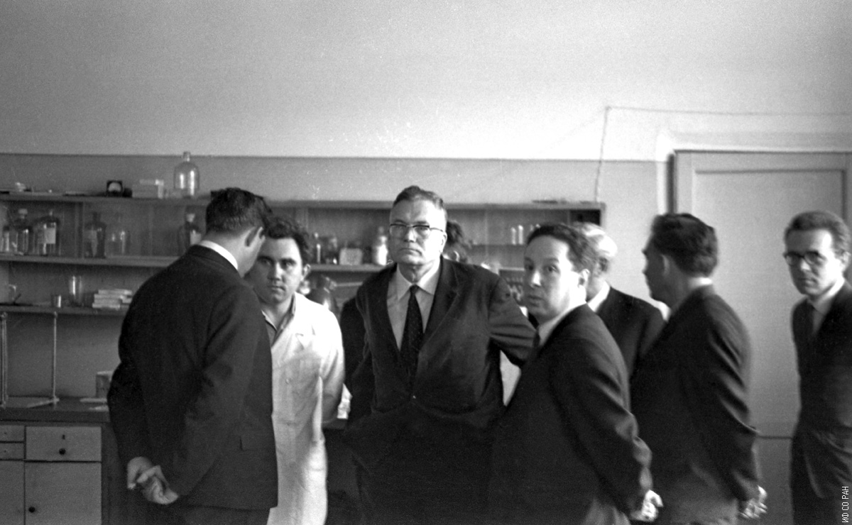 1969 год. Во время посещения Института физики Сибирского отделения Академии наук СССР (ИФ СО АН СССР) заместителем председателя Государственного комитета СССР по науке и технике Кириллиным В.А. и первым секретарем Красноярского краевого комитета коммунистической партии Советского Союза Долгих В.И. Слева направо: Долгих В.И., Кононов В.П., Кириллин В.А., Лундин А.Г., Терсков И.А., Вейсиг Г.С. Красноярск.