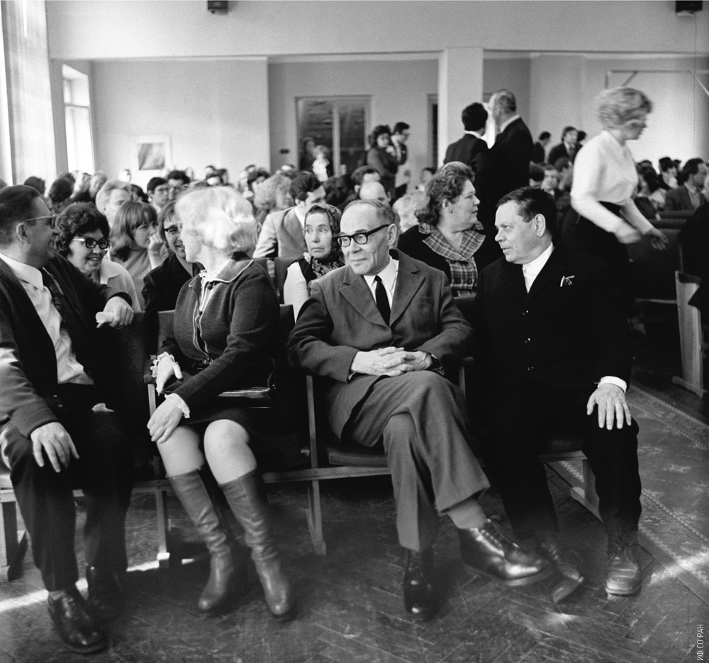 В конференц-зале Института физики им. Л.В. Киренского Сибирского отделения Академии наук СССР на научных чтениях, посвященных памяти академика Л.В. Киренского, организатора и первого директра института. Слева направо: В.А. Игнатченко, И.С.Эдельман, Л.Н. Звегинцева, А.В. Коршунов, С.Ф. Холкин, 8 апреля 1977 года.