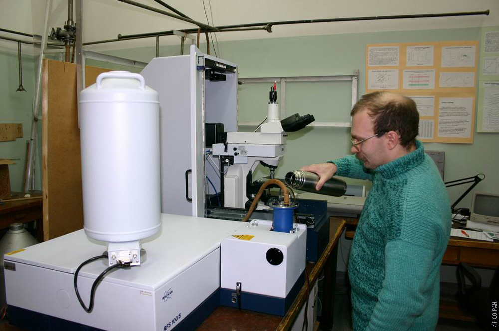 2005 год. Крылов Александр Сергеевич, старший научный сотрудник лаборатории молекулярной спектроскопии Института физики им. Л.В. Киренского Сибирского отделения Российской академии наук (ИФ СО РАН), заливает жидкий азот в криостат на спектрометре комбинационного рассеяния света Bruker RFS-100/s. Красноярск.