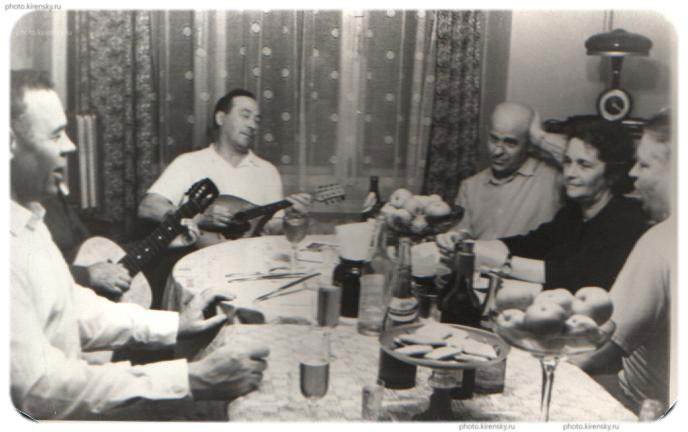 Академик Леонид Васильевич Киренский, организатор и первый директор Института физики Сибирского отделения Академии наук СССР, писал стихи, прекрасно их читал, мог играть на домбре и балалайке и прекрасно пел. 1950-ые годы. Киренский на встрече с друзьями и коллегами в своем доме. Красноярск.