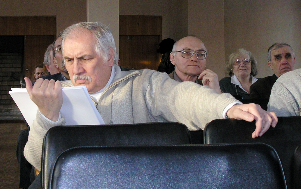 2005 год. На семинаре в конференц-зале Института физики им. Л.В. Киренского Сибирского отделения Российской академии наук (ИФ СО РАН). Слева направо: Рауф Садыкович Исхаков, Игорь Николаевич Флёров, Клара Александровна Саблина, Борис Валерьевич Безносиков. Красноярск.
