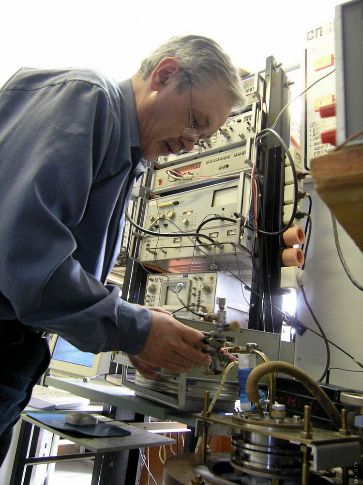За работой на спектрометре антиферромагнитного резонанса в импульсных полях Васильев В. Н., сотрудник лаборатории резонансных свойств магнитоупорядоченных веществ Института физики им. Л.В. Киренского Сибирского отделения Российской академии наук (ИФ СО РАН). Фото 2001 года. Красноярск.