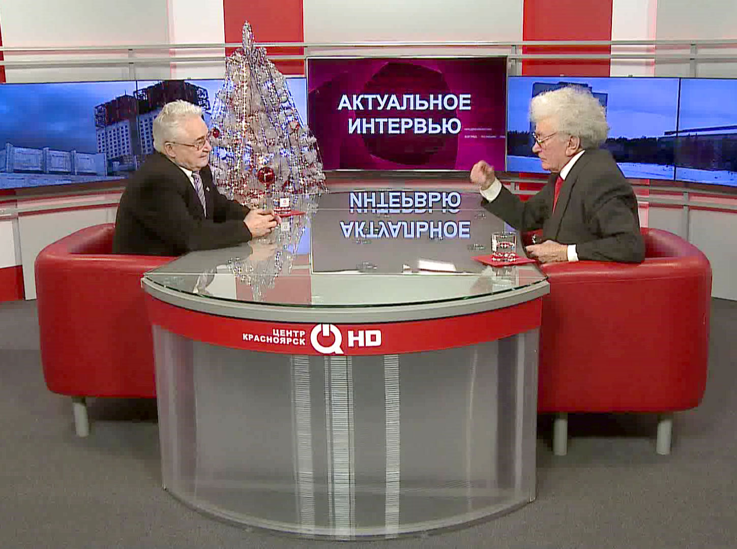 Академик В.Ф. Шабанов (слева), председатель Президиума Красноярского научного центра Сибирского отделения Российской академии наук ( КНЦ СО РАН), поздравляет жителей города и края с наступающим Новым 2015 годом на телевидении Красноярска в программе Л.Е. Фельдмана «Актуальное интервью». Снимок 29 декабря 2014 года.