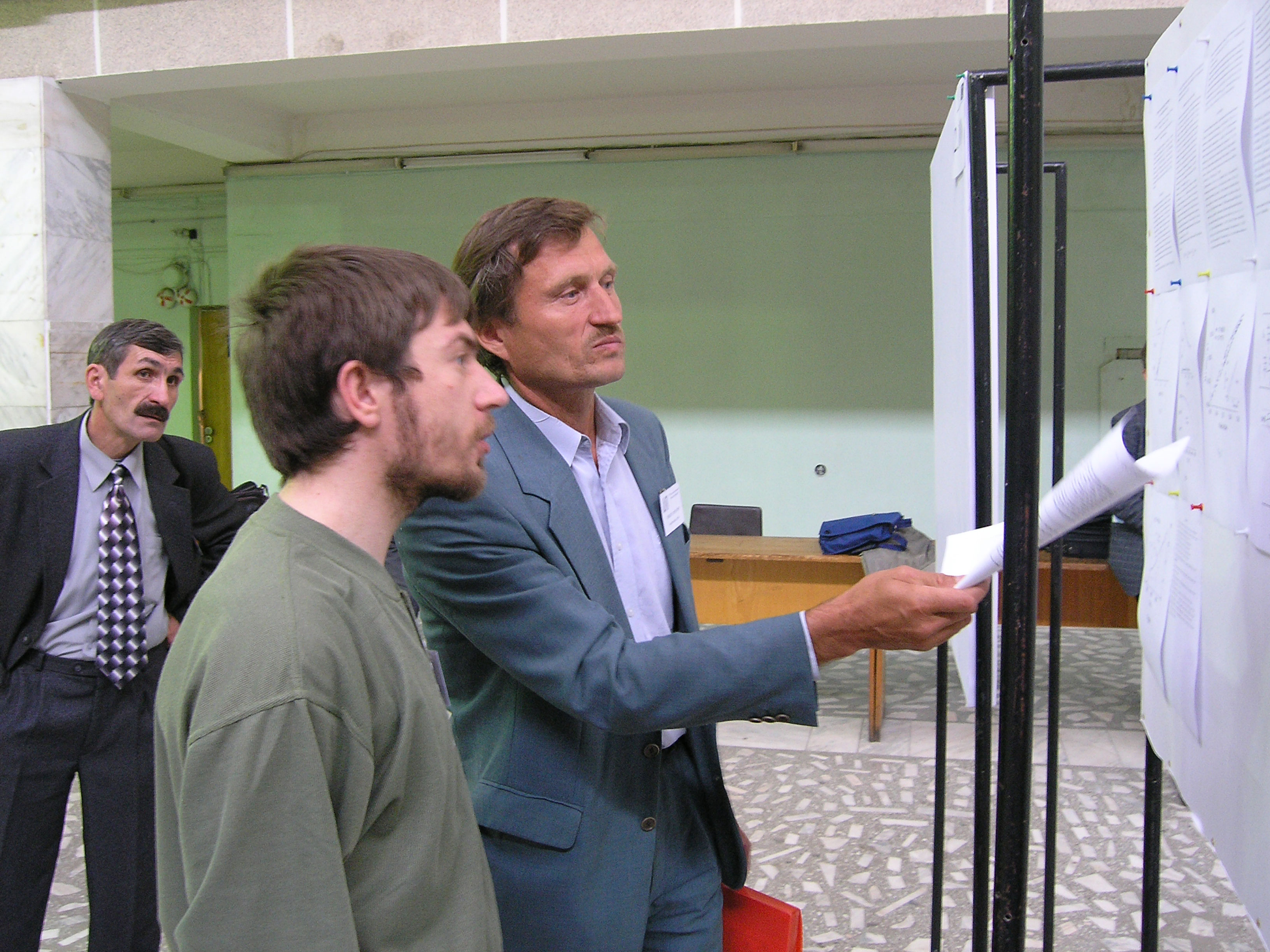 Аплеснин С.С. (справа), ведущий научный сотрудник лаборатории теоретической физики Института физики им. Л.В. Киренского Сибирского отделения Российской академии наук (ИФ СО РАН), участник Евро-Азиатского симпозиума «Прогресс в магнетизме» (ЕASTMAG-2004), организованного и проведенного в Красноярске 24-27 августа 2004 года, у стендового доклада.
