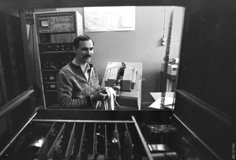 Черкасов Борис Игоревич, инженер-конструктор в лаборатории радиоспектроскопического структурного анализа Института физики им. Л.В. Киренского Академии наук СССР (ИФ СО АН СССР). Снимок 1985 года. Красноярск.