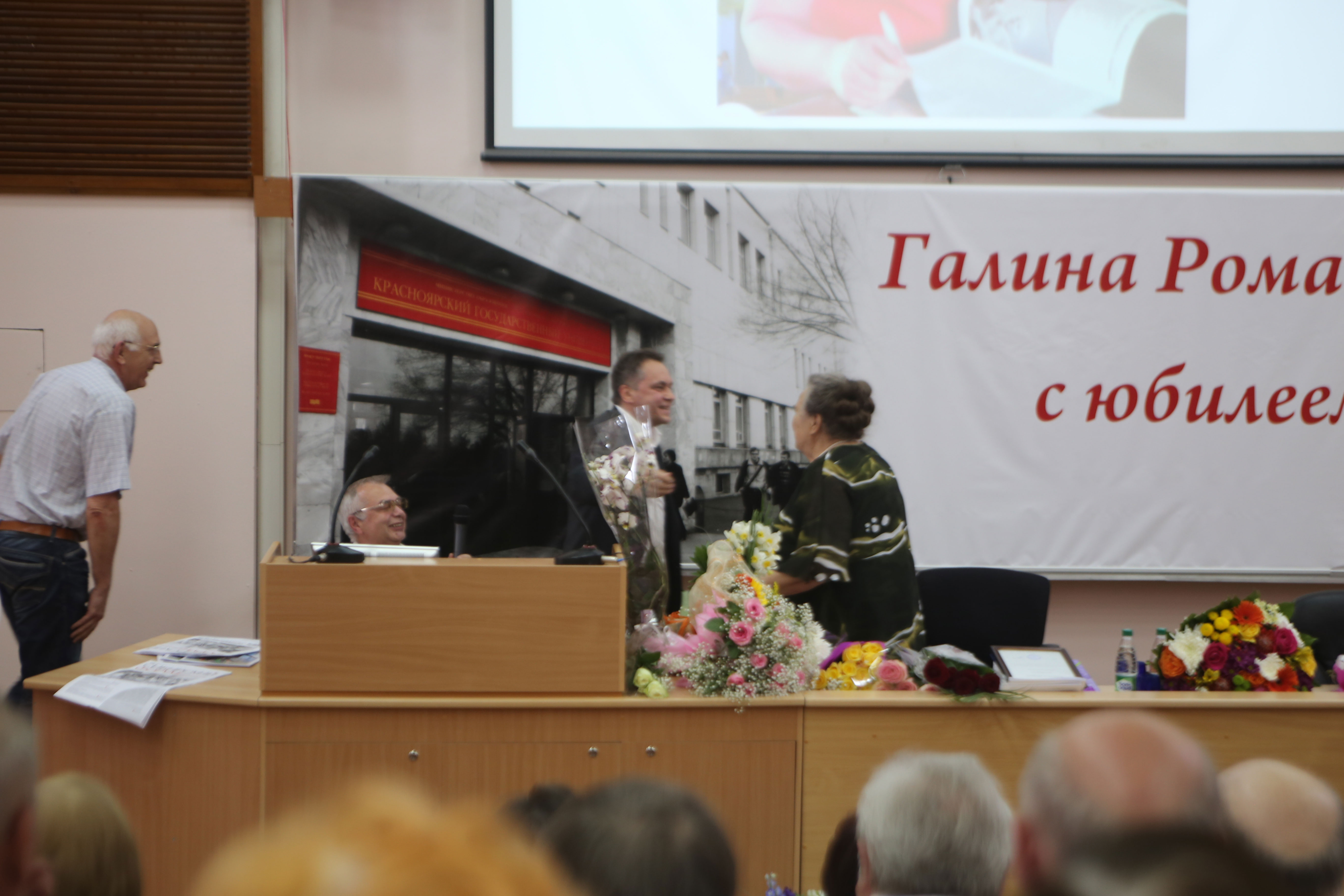 2015 год, 21 мая. Галину Романовну Балуеву с 80-ним юбилеем поздравляет директор Института физики им. Л.В. Киренского Сибирского отделения Российской академии наук (ИФ СО РАН) Никита Валентинович Волков.
