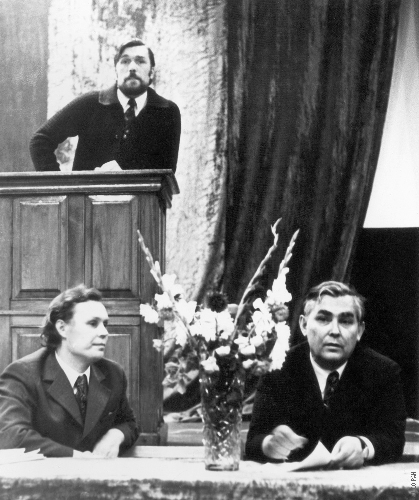Хрусталев Б.П. (слева), Терсков И.А., выступает Чистяков Н.С. на традиционных научных чтениях, посвященных памяти академика Киренского Л.В., организатора и первого директора Института физики Сибирского отделения Академии наук СССР. Фото 1974 года. Красноярск.