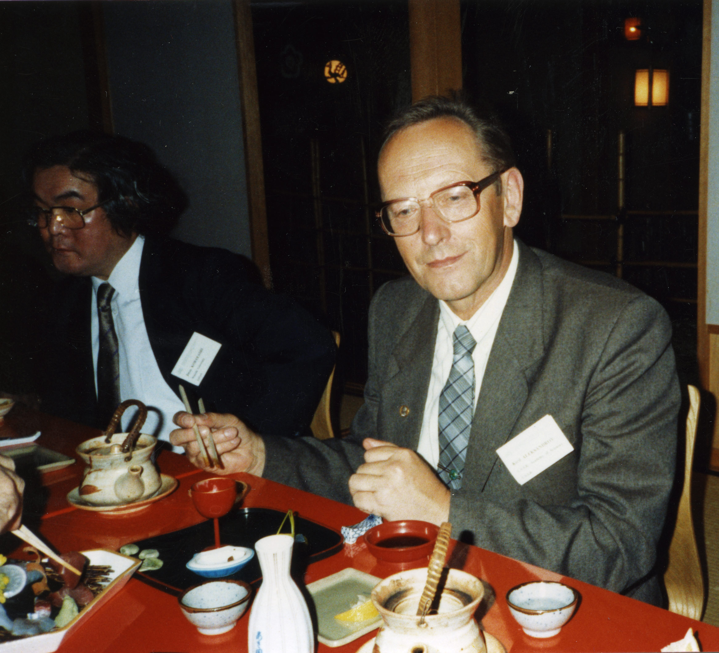 Академик Александров К.С. (справа), директор Института физики им. Л.В. Киренского Сибирского отделения Академии наук СССР, на 14-ом конгрессе по кристаллографии в г. Перт (Австралия), авrуст 1987 года.