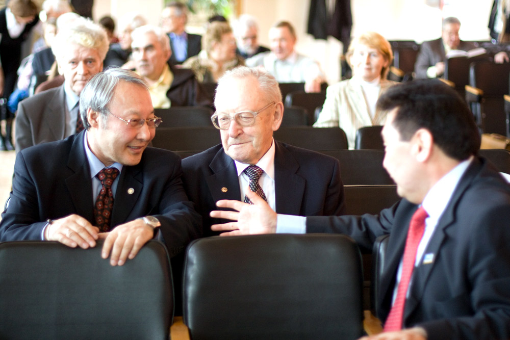 Академик Александров К.С. (в центре) с гостями из Якутии на собрании, посвященном 100-летию со дня рождения Л.В. Киренского, в конференц-зале Института физики им. Л.В. Киренского Сибирского отделения Российской академии наук 9 апреля 2009 года. Красноярск, Академгородок.