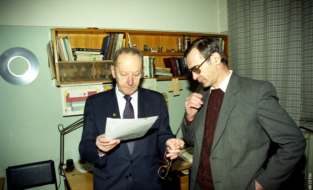 Академик Кирилл Сергеевич Александров, директор Института физики им. Л.В. Киренского Сибирского отделения Российской академии наук (слева) и Александр Дмитриевич Васильев старший научный сотрудник института в лаборатории кристаллофизики, фото 2006 года. Красноярск.