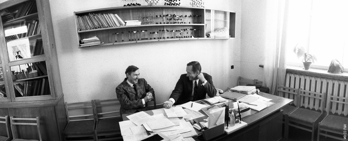 Лаборатория кристаллофизики Института физики им. Л.В. Киренского Сибирского отделения Академии наук СССР (СО АН СССР). Кабинет заведующего лабораторией Александрова К.С. (он справа) и Анистратов А.Т. за обсуждением результатов эксперимента. Фото 1974 года. (Автор фотографии Безносиков Б.В.) Красноярск.