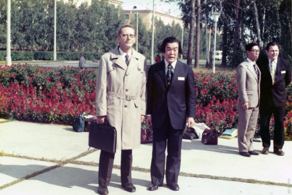 Александров К.С. (слева), член-корреспондент Академии наук СССР, заместитель директора по научной работе Института физики им. Л.В. Киренского Сибирского отделения Академии наук СССР, председатель Советского оргкомитета Первого Советско-Японского симпозиума по сегнетоэлектричеству, с председателем Японского оргкомитета, профессором Дж. Кобаяси. Новосибирск, 1976 год.