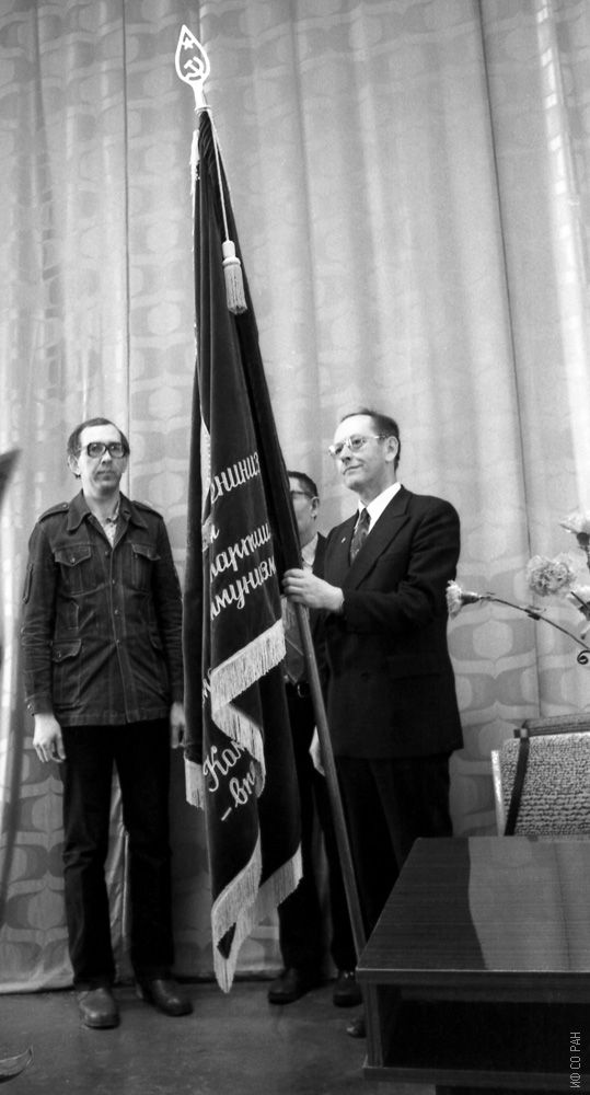 Конференц-зал Института физики им. Л.В. Киренского Сибирского отделения Академии наук СССР (ИФ СО АН СССР) Александров К.С. (справа) и Овчинников С.Г. принимают Знамя победителей в социалистичеcком соревновании между институтами Красноярского научного центра Сибирского отделения АН СССР в 1979 году. Красноярск.