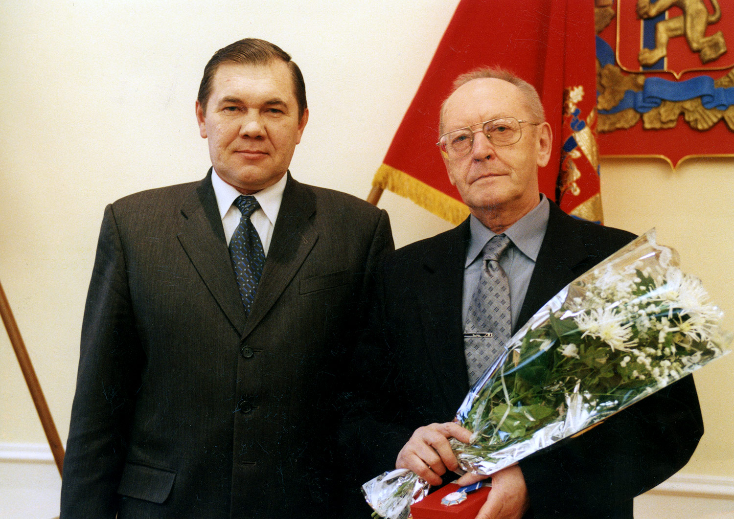 Академик Александров К.С. (справа), директор Института физики им. Л.В. Киренского Сибирского отделения Российской академии наук, после вручения ему ордена Почета. Фото на память с губернатором Красноярского края Лебедем А. И., 2002 год. Красноярск.