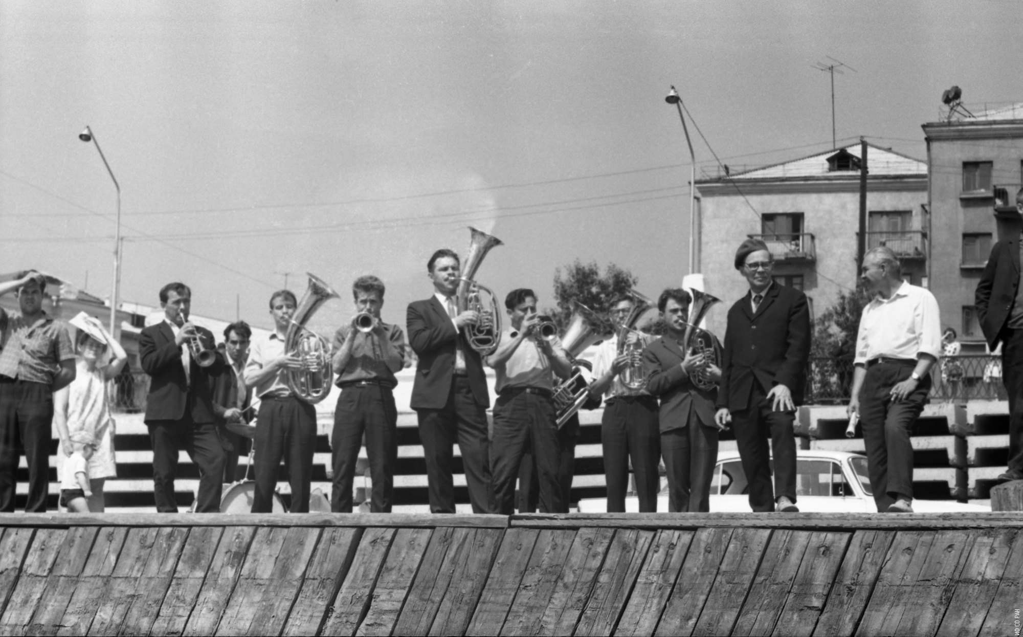 Духовой оркестр на пристани речного вокзала Красноярска, который традиционно отправлял все теплоходы в рейс по Енисею маршем «Славянка», фото 1969 года.