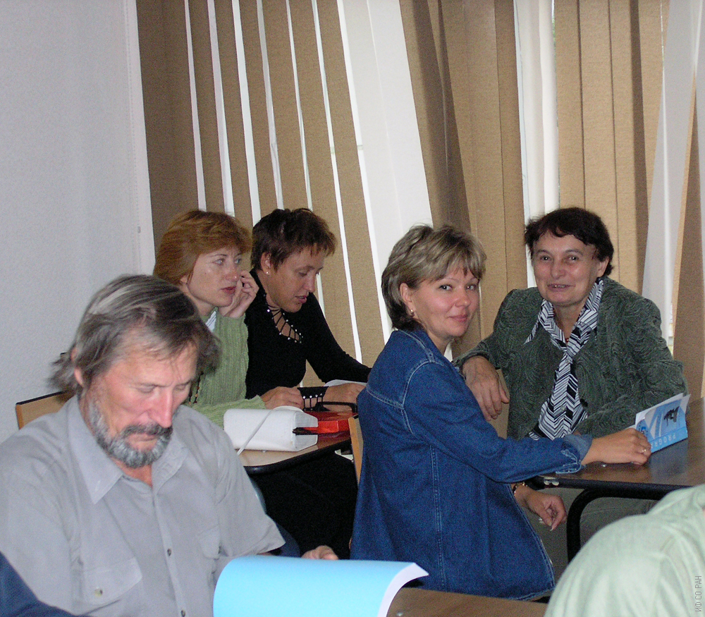 Рабочий момент на Евро-Азиатском симпозиуме «Прогресс в магнетизме» (ЕASTMAG-2004). Заседание секции «Микрокристаллические, аморфные и пористые слои. Новые приборные структуры на основе объемного материала и наноструктур». Сотрудники Института физики им. Л.В. Киренского Сибирского отделения Российской академии наук (ИФ СО РАН): в первом ряду, слева направо: Жигалов В.С., Серёдкина Ж. В., Чеканова Л.А. В следующем ряду: Кузовникова Л.А. (слева), Денисова Е. А., Красноярск, август 2004 г.