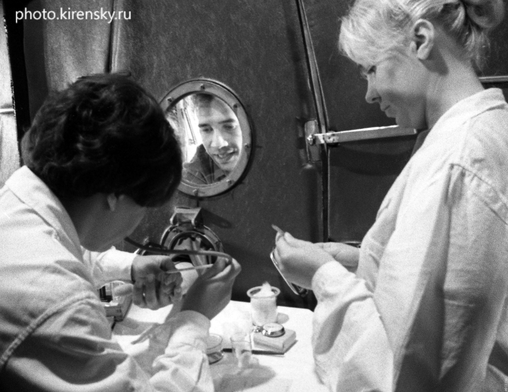 Идет сеанс очередной связи с испытателями в установке «БИОС-3».Эксперимент отдела биофизики Института физики им. Л.В. Киренского Сибирского отделения Академии наук СССР (ИФ СО АН СССР) в 1973 году. На связи испытатель Терских Владислав Владимирович (в иллюминаторе).