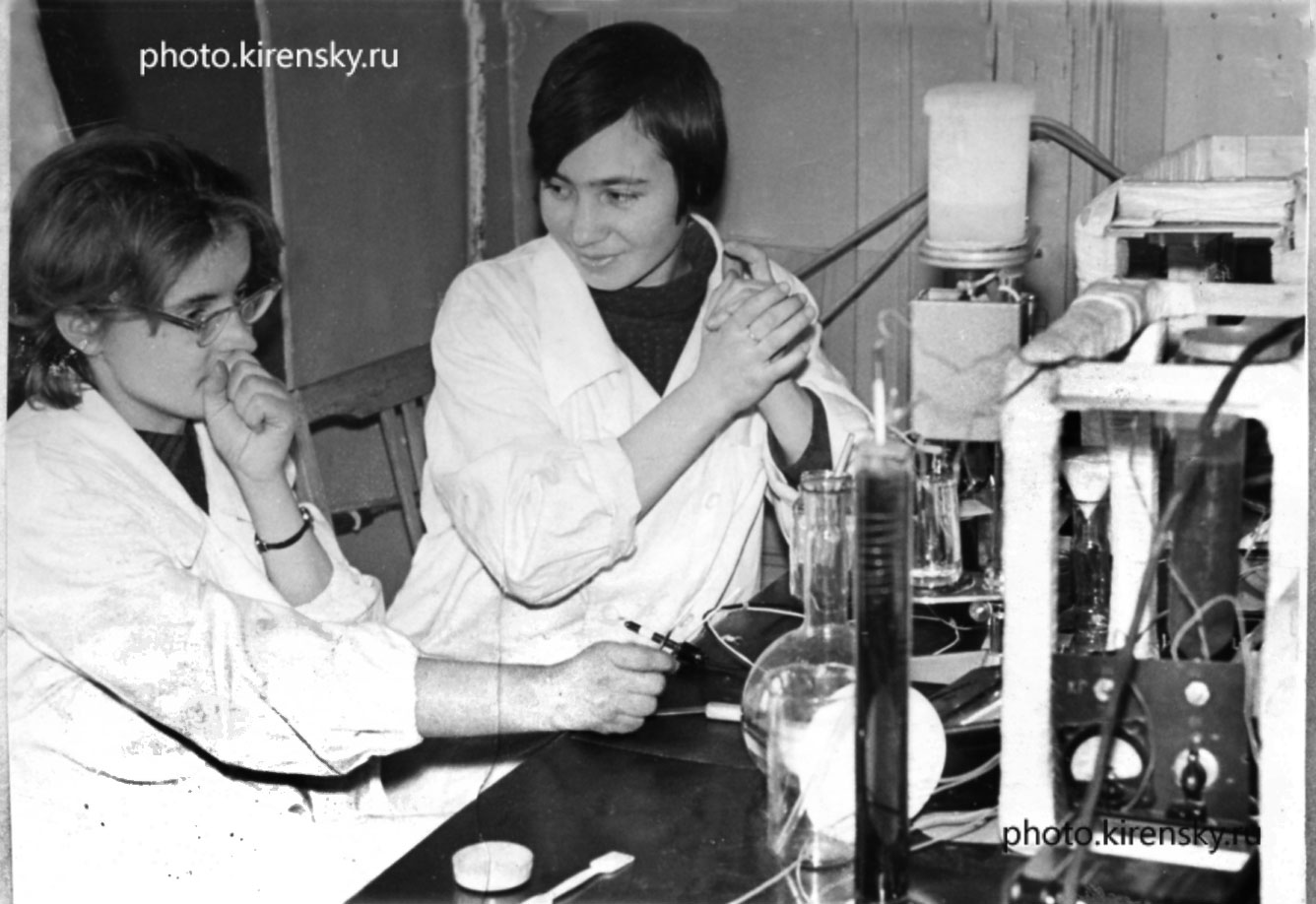 1967 год. Старший инженер В.А. Елманова (слева) и инженер Т.Г. Дегтярева, сотрудники лаборатории высокочастотных и импульсных свойств тонких магнитных пленок Института физики Сибирского отделения Академии наук СССР (ИФ СО АН СССР) (СО АН СССР с 1991 года СО РАН), за установкой по исследованию электролитического осаждения тонких магнитных пленок. Красноярск.