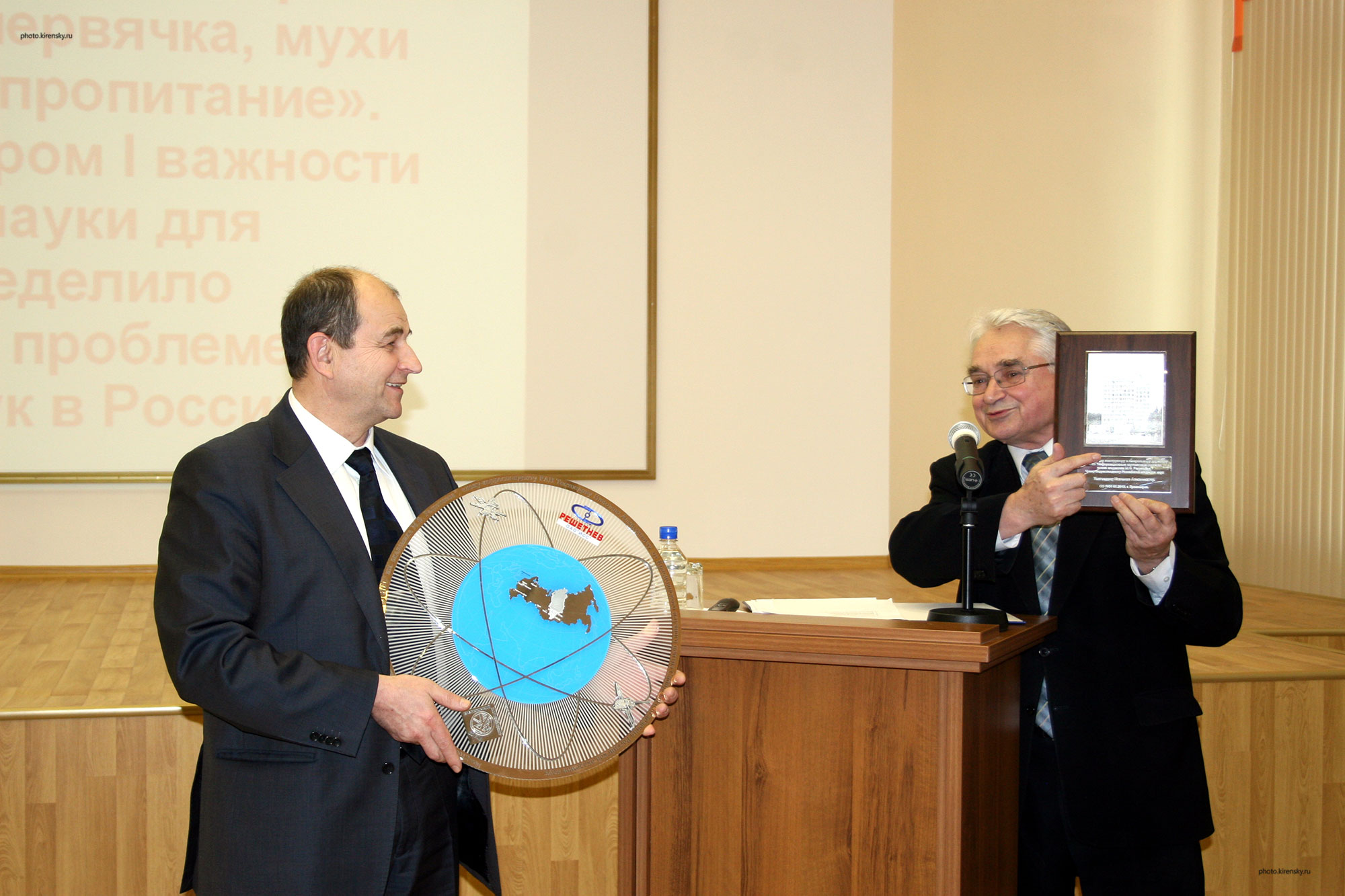 В феврале 2012 года Институт физики им. Л.В. Киренского Сибирского отделения Российской академии наук (ИФ СО РАН) посетил академик Тестоедов Николай Алексеевич, генеральный конструктор и генеральный директор ОАО «Информационные спутниковые системы» имени академика М. Ф. Решетнёва города Железногорска. На снимке: Тестоедов Николай Алексеевич (слева) и Шабанов Василий Филиппович, председатель Президиума Красноярского научного центра СО РАН, в конференц-зале Института физики во время заседания ученого Совета.