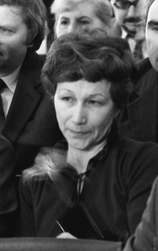 1984 год. Хрусталёва Людмила Михайловна, сотрудник лаборатории сильных магнитных полей Института физики им. Л.В. Киренского Сибирского отделения Академии наук СССР в конференц-зале института на заседании ученого Совета института, посвященного памяти академика Л.В. Киренского.