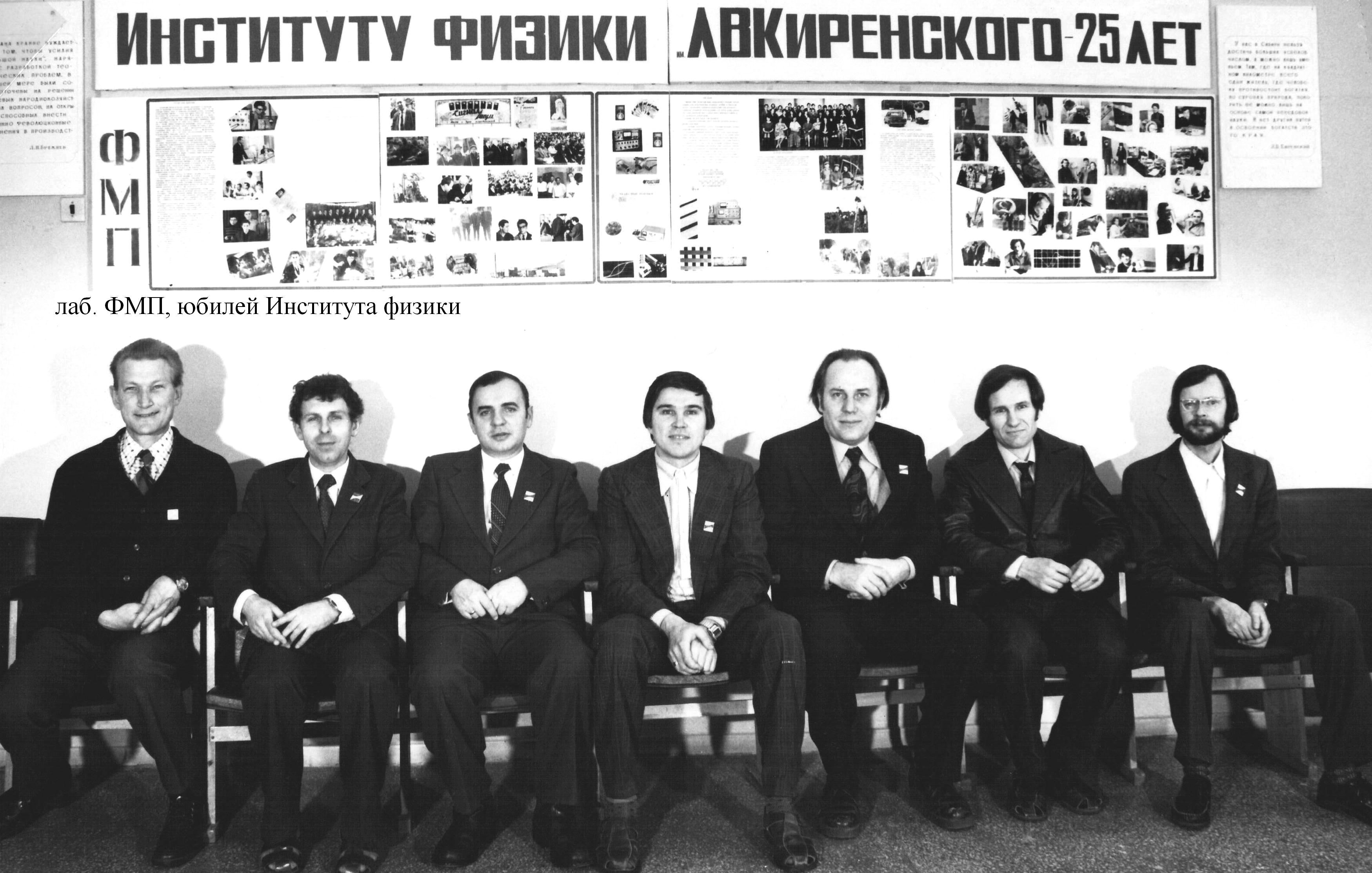 1981 год. Институту физики им. Л.В. Киренского Сибирского отделения Академии наук СССР исполнилось 25 лет. Фото на память. Сотрудники лаборатории физики магнитных плёнок, слева направо: Мальцев В.К., Резуненко В.П., Ерухимов М.Ш, Тюрнев В.В., Польский А.И., Яковчук В.Ю., Вершинин В.В. Красноярск.
