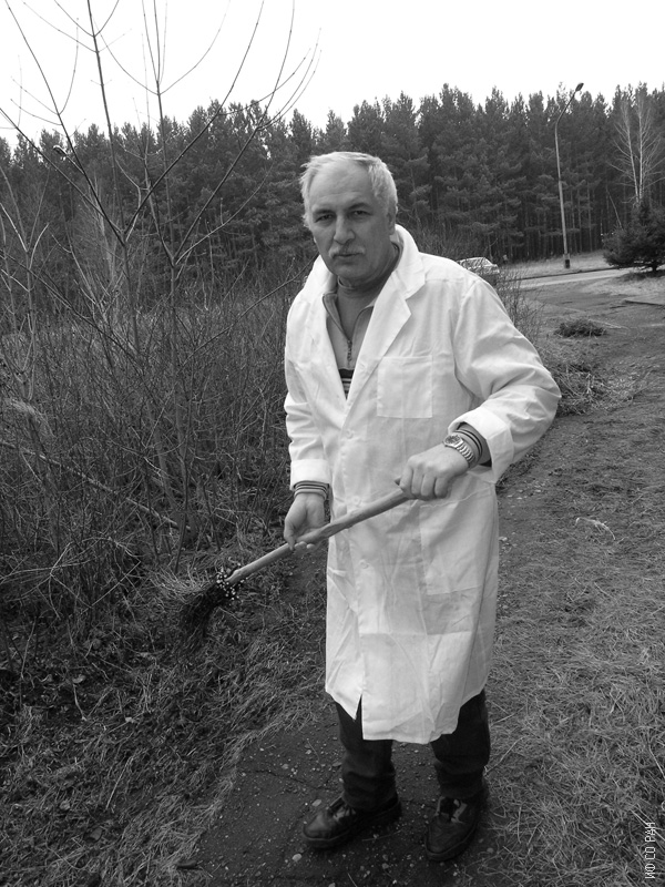 Весна 2004 года. Исхаков Р. С., заведующий лабораторией физики магнитных пленок Института физики им. Л.В. Киренского Сибирского отделения Российской академии наук (ИФ СО РАН), на общеинститутском субботнике по уборке территории института. Красноярск.