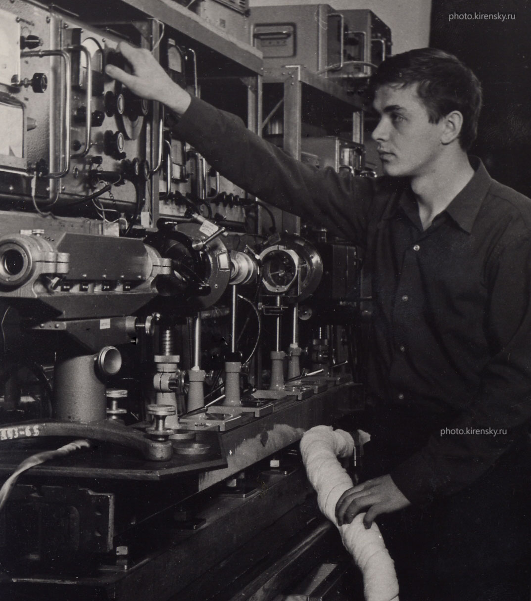 Игорь Искорнев, дипломник Красноярского государственного университета, за работой на установке для измерения электро -оптических коэффициентов кристаллов в лаборатории кристаллофизики Института физики им. Л.В. Киренского Сибирского отделения Академии наук СССР (ИФ СО АН СССР). Снимок 1969 года. Красноярск.
