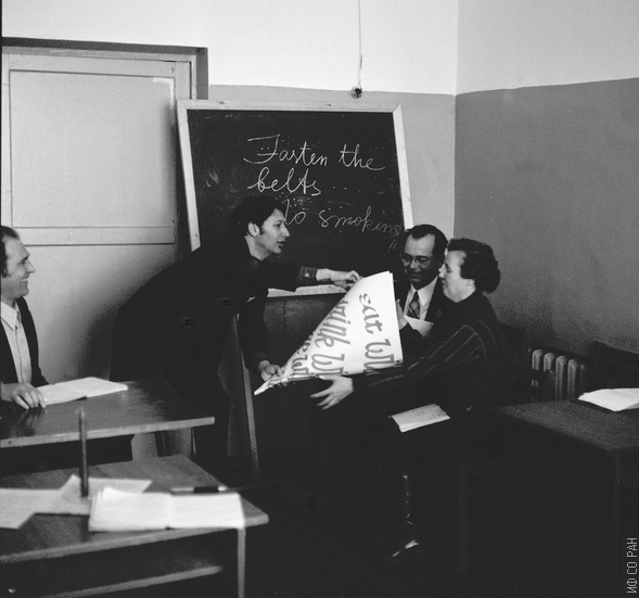 Слева направо: Зеер Э.П., Бержанский В.Н., Ковров Б.Г., Зайцева М.П., сотрудники Института физики им. Л.В. Киренского Сибирского отделения Академии наук СССР, на занятиях в группе по ускоренному изучению английского языка (кафедра иностранных языков института), фото 1976 года, Красноярск.