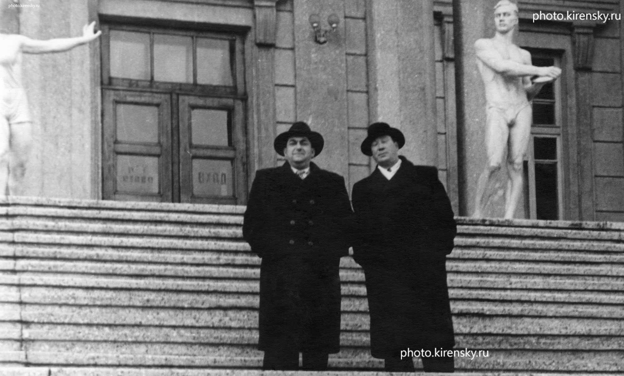 Академик Л.В. Киренский (справа), организатор и первый директор Института физики Сибирского отделения Академии наук СССР (ИФ СО АН СССР) и Л.И. Слободской, преподаватель Красноярского государственного педагогического института, с которым Леонид Васильевич дружил, на ступенях речного вокзала в Красноярске. Снимок. 1960 года.