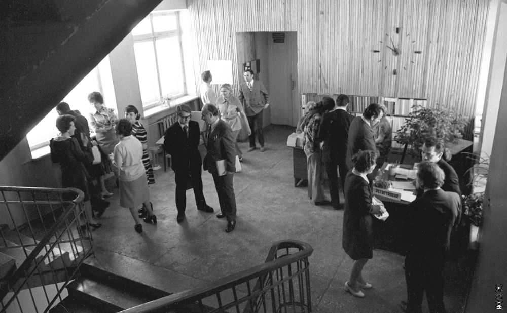 В 1976 году отдел биофизики организовал и провел в Красноярске Всесоюзное совещание по управляемому биосинтезу водородных бактерий и других хемоавтотрофов. На фото перерыв в работе конференции. В эти годы в холле института организовывались выставки новых поступлений книг в библиотеку.
