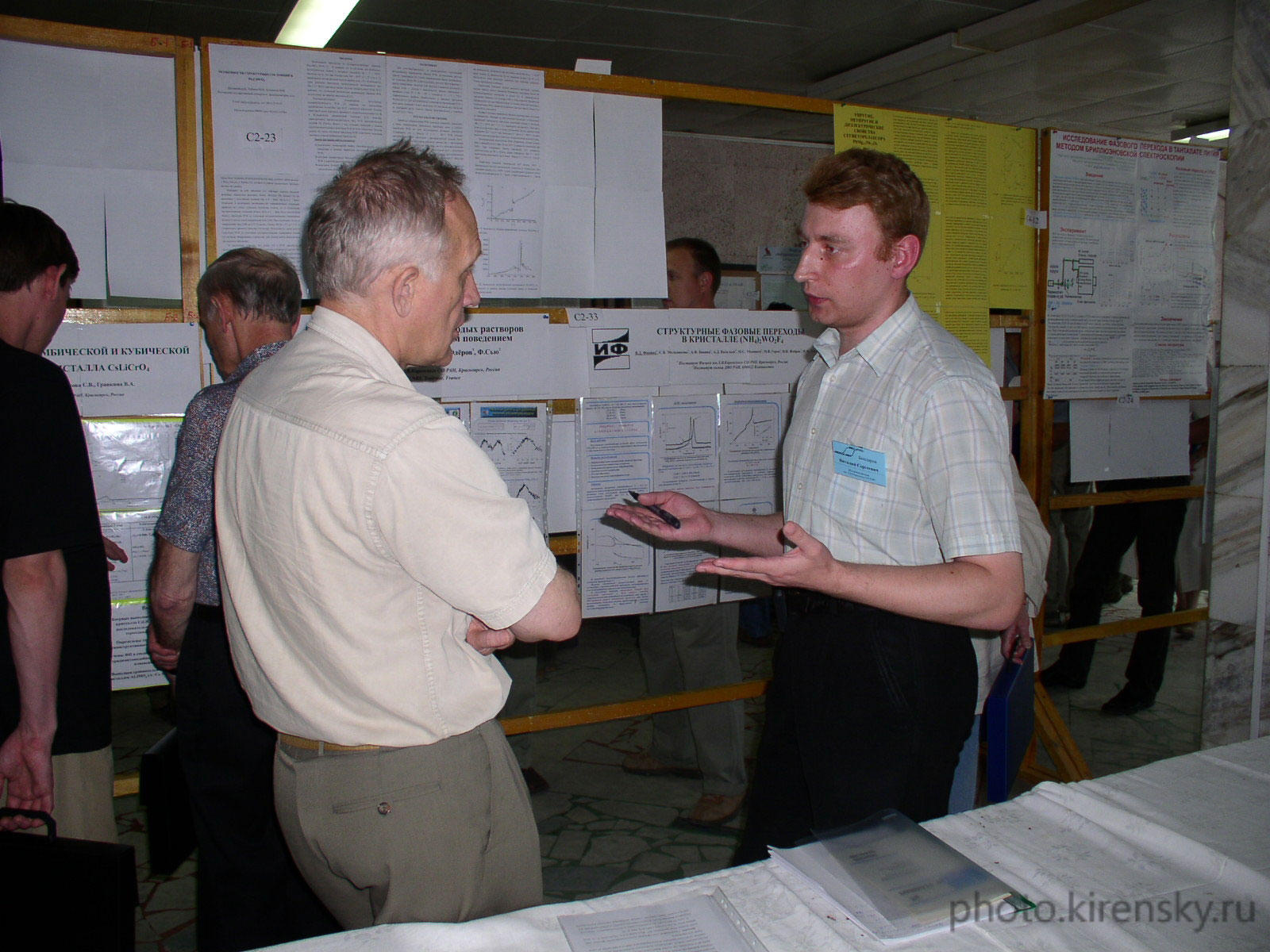 Бондарев Виталий Сергеевич (справа), старший научный сотрудник лаборатории кристаллофизики Института физики им. Л.В. Киренского Сибирского отделения Российской академии наук, у стендовых докладов на VIII Всероссийской конференции по физике сегнетоэлектриков, Пенза, 2008 год.