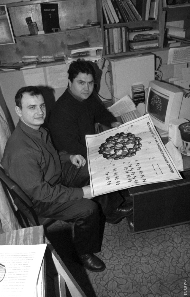 Кузубов Александр Александрович (слева) и Аврамов Павел Вениаминович, сотрудники Института физики им. Л.В. Киренского Сибирского отделения Российской академии наук (ИФ СО РАН), обсуждают модель фуллереновой структуры, фото 2002 года. Красноярск.