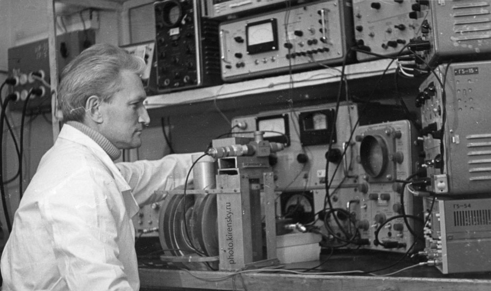 1992 год. На снимке Мальцев Вадим Константинович, младший научный сотрудник лаборатории магнитодинамики Института физики им. Л.В. Киренского Сибирского отделения Российской академии наук (ИФ СО РАН), за работой на установке по исследованию явления ядерного магнитного резонанса в тонких магнитных пленках. Красноярск.