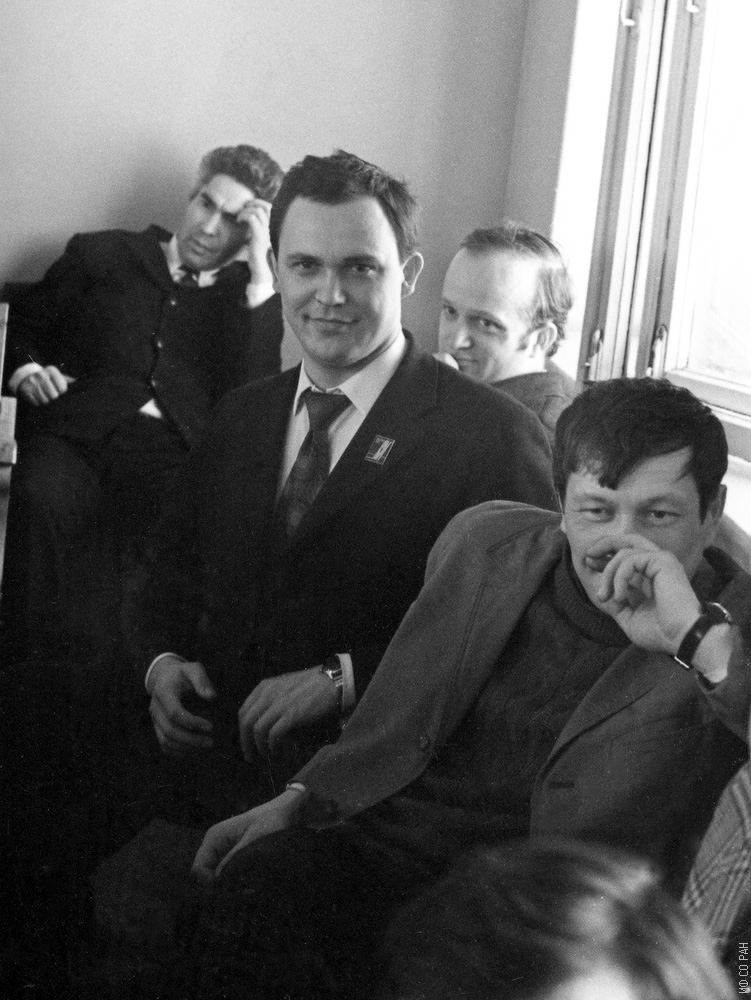 Сотрудники Института физики им. Л.В. Киренского Сибирского отделения Академии наук СССР (ИФ СО АН СССР) в конференц-зале института на обще институтском семинаре по философии. На переднем плане: Петров М. И. (слева) и Зиненко В. И. Фото 1970 года. Красноярск.