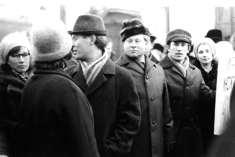 Хрусталева Л.М., Хрусталев Б.П., Кулишевский В.Д., Жигалов В.С. Жигалова Т.М (слева направо), сотрудники Института физики им. Л.В. Киренского Сибирского отделения Академии наук СССР на демонстрации трудящихся 7 ноября 1971 года. Демонстрация в честь Октябрьской революции 1917 года. Красноярск.