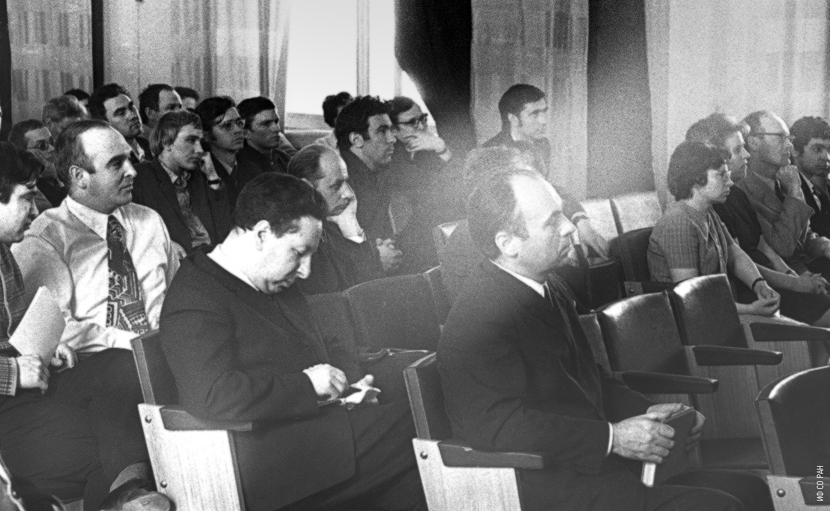 В конференц-зале Института физики Сибирского отделения Академии наук СССР на общеинститутском философском семинаре. В первом ряду - Лисовский Г.М., во втором ряду, крайний слева Лундин А.Г., В третьем ряду, слева направо: Даутов Ш.А., Айзенберг Л.А., Смолин Р.П., фото 1969 года. Красноярск.