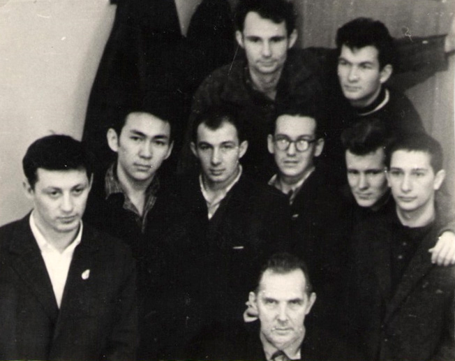 Студенты радиофизического факультета Томского государственного университета им. В.В. Куйбышева. Сидит - профессор Сапожников. Средний ряд: крайний слева Эдуард Лещев, ?, ?, ?, Владимир Усков и Владимир Бержанский. Верхний ряд: Игорь Пухов (слева) и Олег Баюков. Снимок 1961 года. Томск.